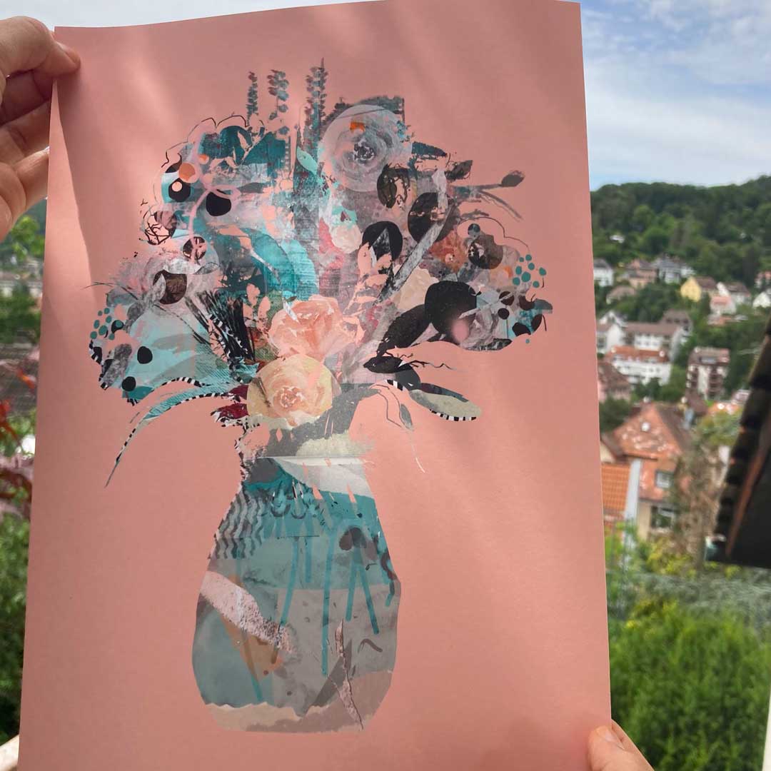Primero pinto las flores en acuarela o acrílico, luego las envuelvo digitalmente con muchas texturas y más colores en un florero y finalmente las imprimo en Giclée.